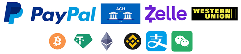 We support payment methods as below: International Bank Wire Transfer (ACH/Wise/Zelle), Paypal, Cryptocurrency (Bitcoin/Ethereum/USDT), Western Union, Alipay and Wechat pay, you can choose the payment method you like.